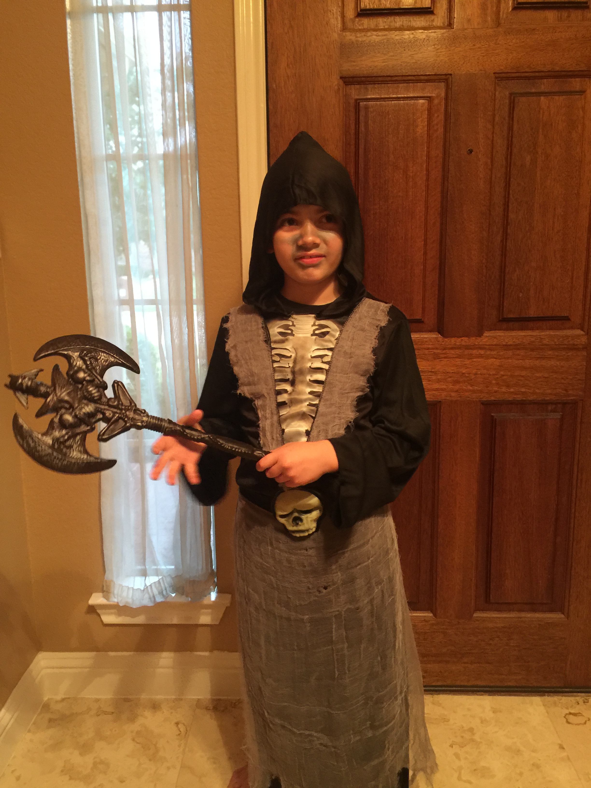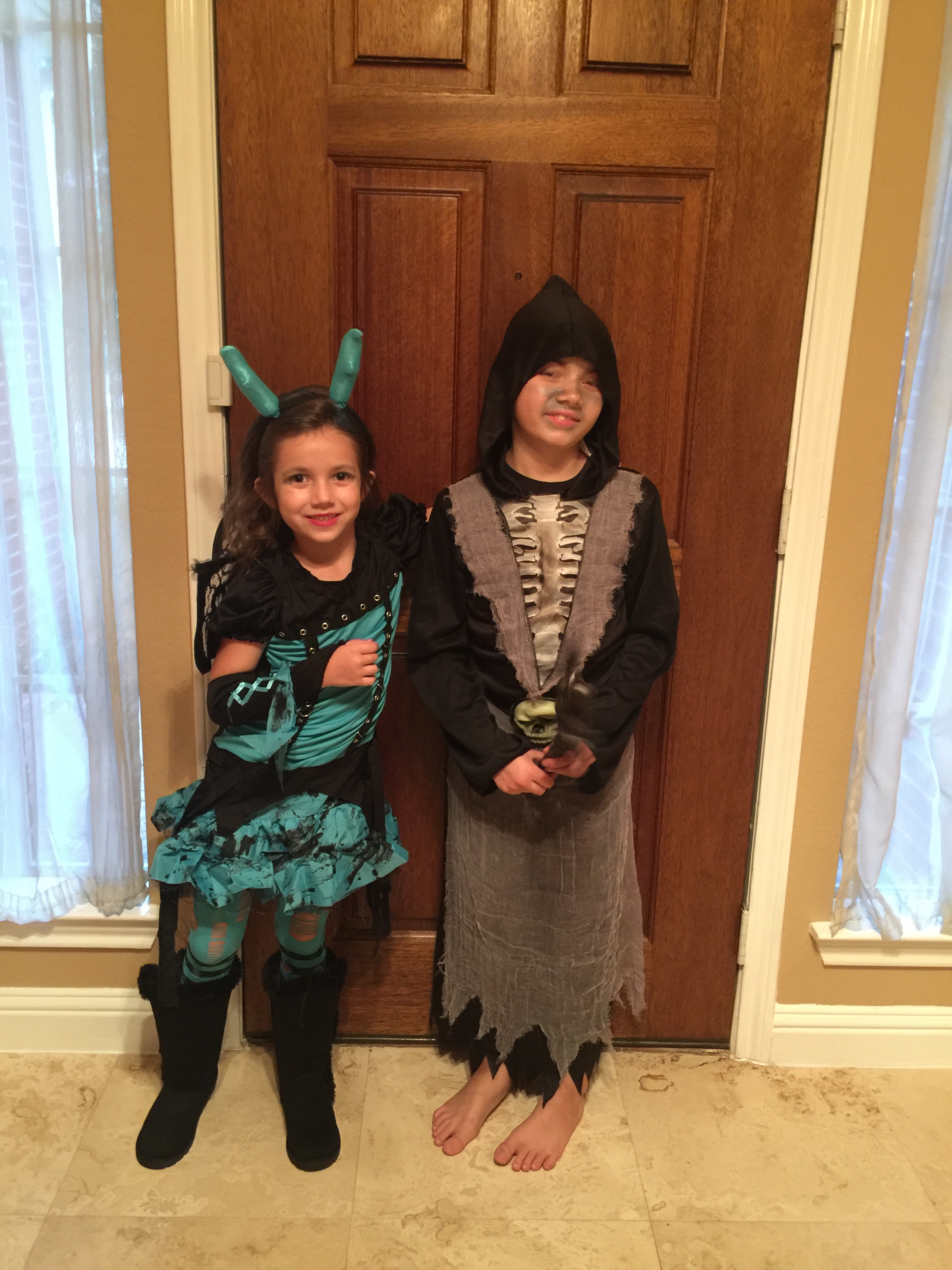 Once Grace and I got dressed (I was a mishmash of a headless horseman shirt with a Cookie Monster headband and spider earrings), Ryan spelled out:  ALL OF US LOOK GOOD EXCEPT FOR DAD.