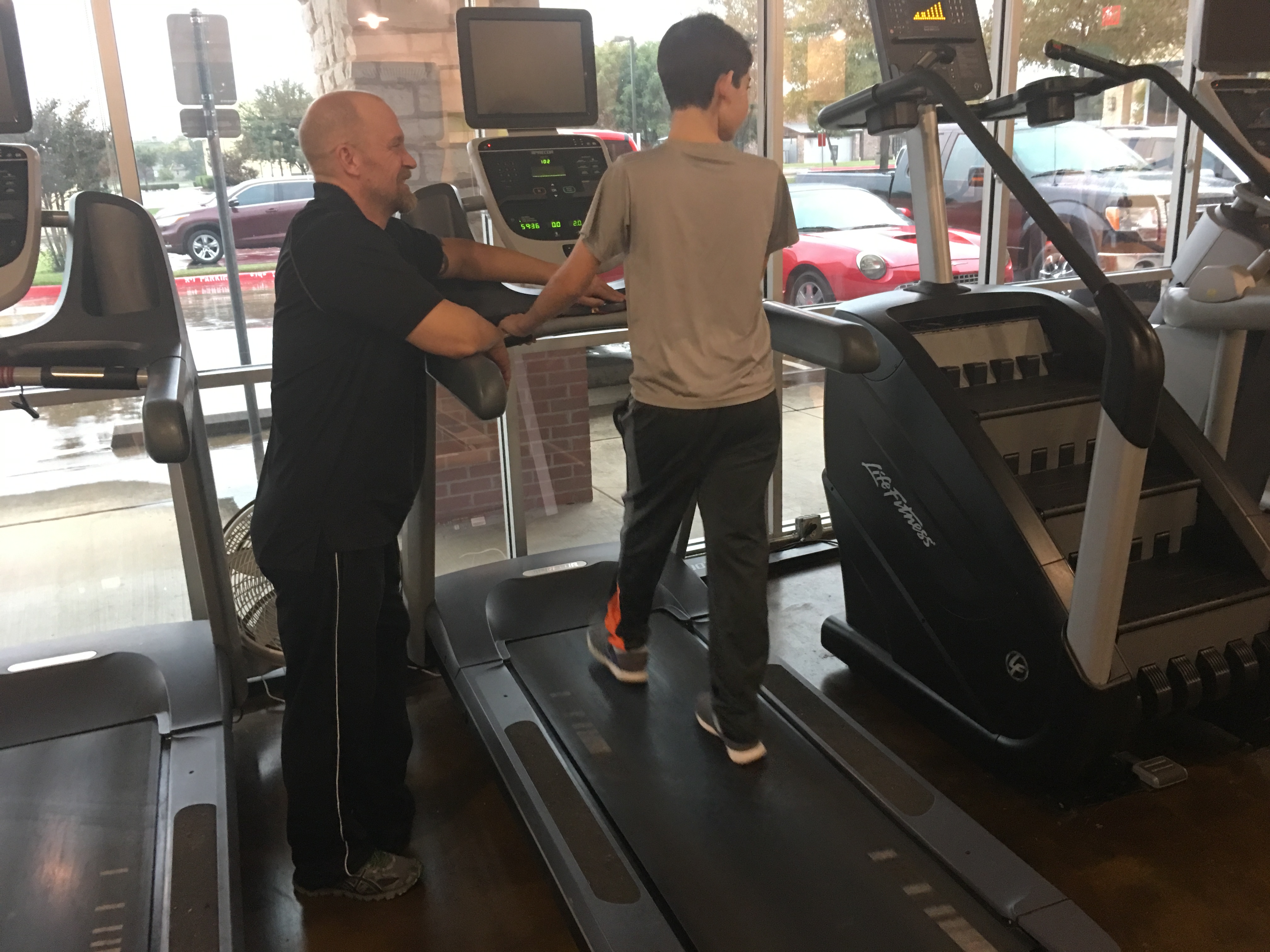 Working on walking on the treadmill with his trainer, Lee.